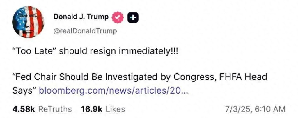 继多次要求美国联邦储备委员会降息遭拒,进而威胁替换现任美联储主席鲍威尔后,美国总统特朗普再次向鲍威尔发难,并要求国会调查鲍威尔。特朗普2日发文说,鲍威尔应立即辞职。连续“开炮”特朗普2日在社交媒体上转发关于鲍威尔应被调查的文章,并点评称“‘太迟(先生)’应该立即辞职!!!”